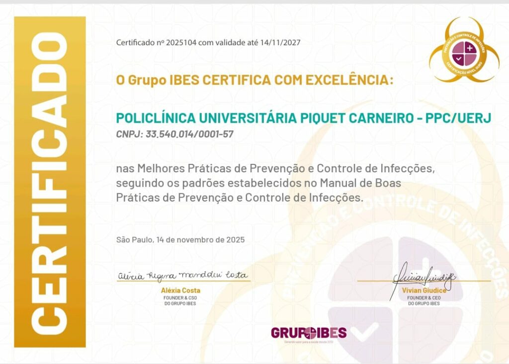 O recém-renovado “Selo de Boas Práticas de Prevenção e Controle de Infecção com Excelência”, conferido pelo Instituto Brasileiro para Excelência em Saúde (Ibes), atesta que a Policlínica Universitária Piquet Carneiro (PPC/Uerj) é um ambiente seguro para a circulação de pacientes e colaboradores porque toma medidas para evitar a proliferação de doenças infecciosas, como tuberculose, sarampo e influenza. Validadas internacionalmente pelo Ibes, essas medidas têm sido aprimoradas continuamente, o que permitiu a conquista do selo pela quarta vez.